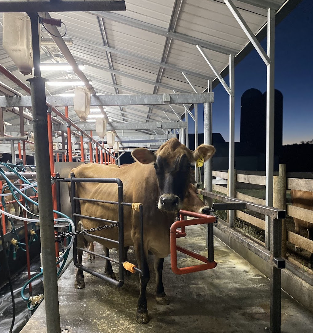 Sweet # 129 patiently waits for her cow mates to walk in the parlor before they are milked this morning. She is the beautiful cow that graces the front of our milk cartons!