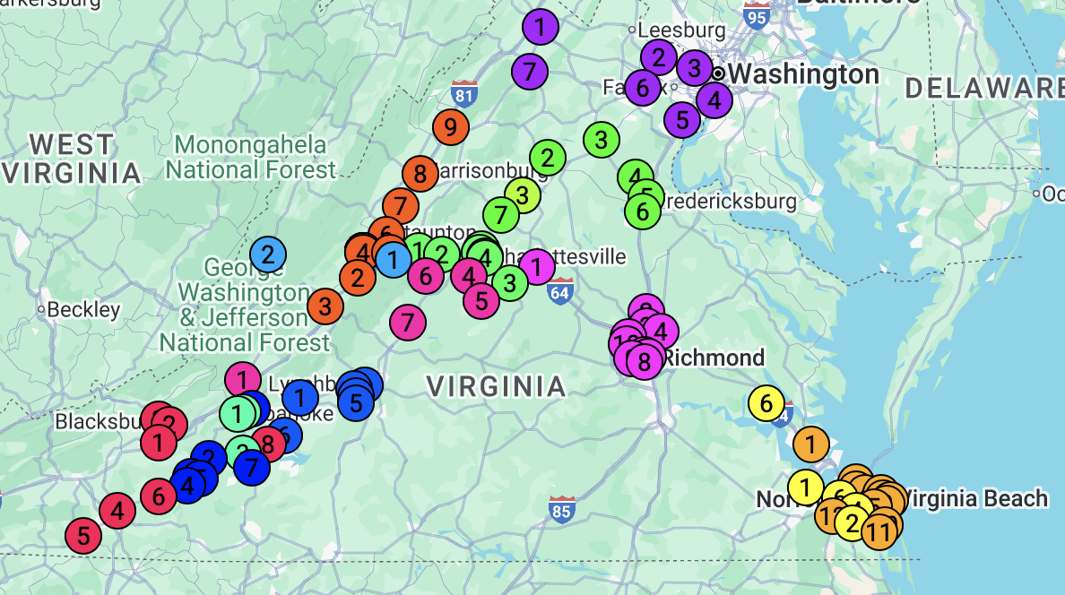 Afton, Alexandria, Arrington/Lovingston, Ashland, Bealeton, Bedford, Blacksburg, Boones Mill, Centreville, Charlottesville, Chesapeake, Christiansburg, Copper Hill, Crozet, Culpeper, Floyd, Forest, Fredericksburg, Front Royal, Galax, Harrisonburg, Hillsville, Lexington, Lynchburg, Madison, McLean, Mechanicsville, Middlebrook, Moneta, Mt. Sidney, New Market, Norfolk, Occoquan, Palmyra, Raphine, Richmond, Roanoke, Rocky Mount, Ruckersville, Scottsville, Staunton, Sterling, Stuart’s Draft, Suffolk, Troutville, VA Beach, Warm Springs (through Foodlore Provisions), Waynesboro, Williamsburg, Willis, Winchester, Wirtz, Yorktown